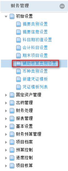 1.点击办公模式→财务管理→初始设置→辅助核算类别设置,进入“辅助核算类别设置”窗口:
